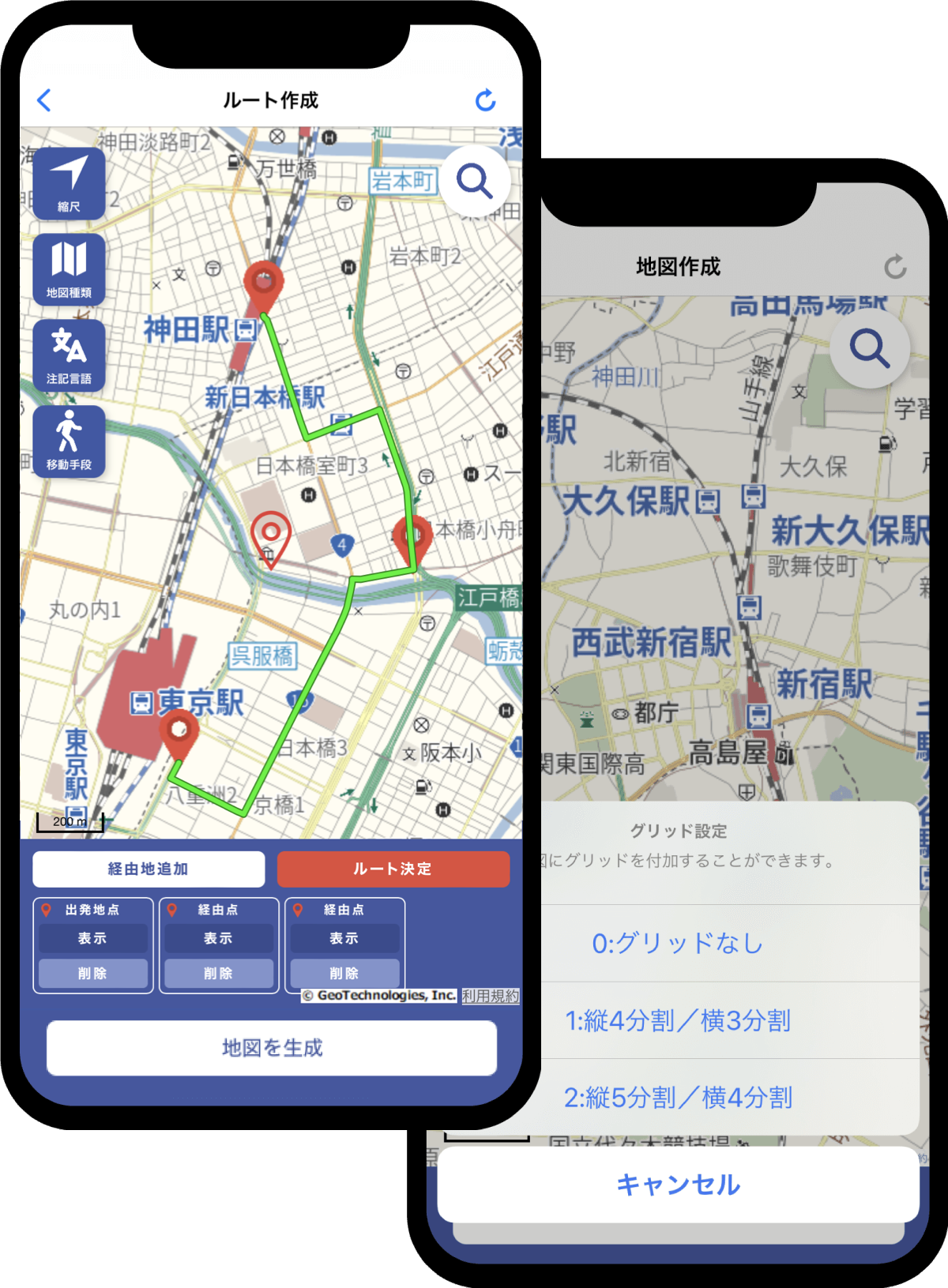 目的地や立ち寄りポイントを指定した経路(ルート)やグリッド格子線の描画が可能です。